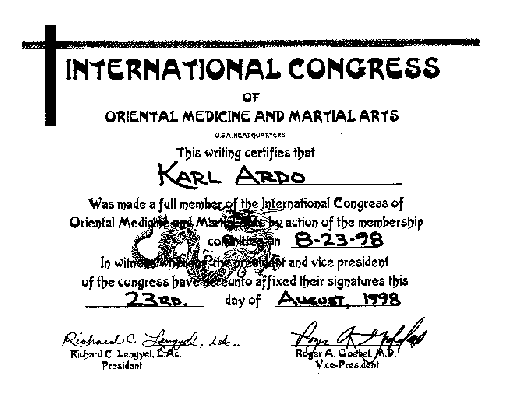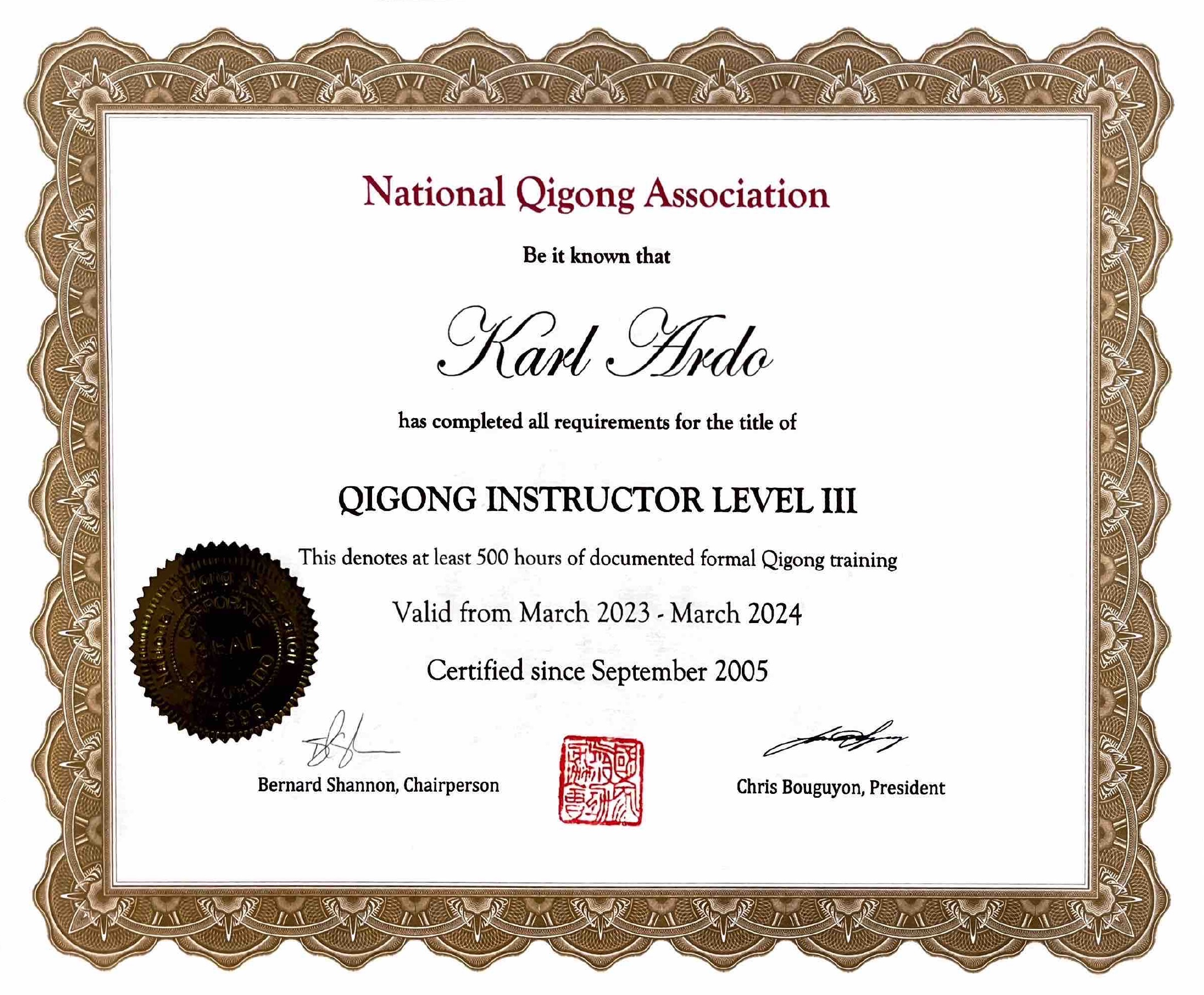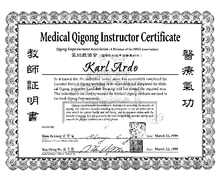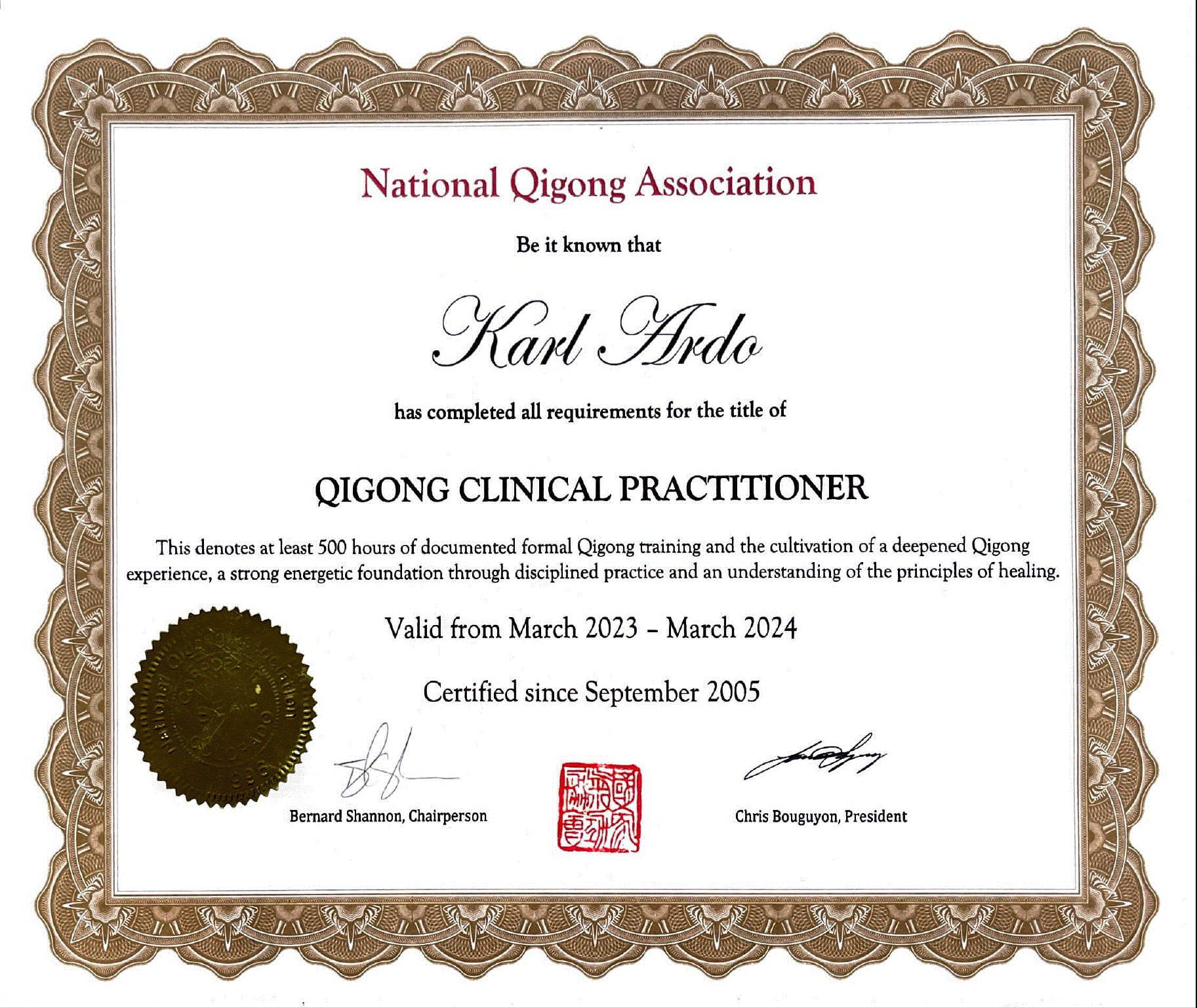 Karl has been involved with energy work since 1974, having studied Tai Chi, meditation, and energy balancing. Karl has been teaching Tai Chi since 1994, most notably at Martial Art of America in Columbia (1997), and before that at World Martial Art (1994-1996). Karl is currently certified as a Medical QiGong instructor (since 1999), a Level III Advanced QiGong Instructor (since 2007), a Clinical Practitioner (since 2007), and is a Certified Zero Balancer (since 2007), specializing in Structural Energy Balancing sessions. He is a member of the International Congress of Oriental Medicine and Martial Arts, and has completed The Chinmaya Lesson-Course.
